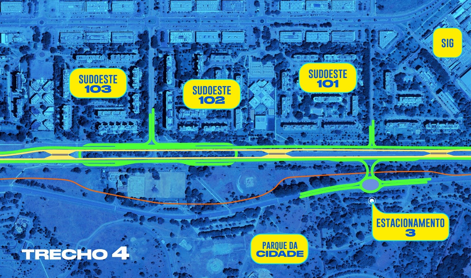 Nos trechos 4 — que passa pelas quadras 101 a 103 do Sudoeste —, 5 — em frente ao Setor de Indústrias Gráficas (SIG) — e 6 — entre o SIG e o Parque da Cidade, na altura do Pavilhão de Exposições — estão sendo executados serviços relacionados à pavimentação da via.