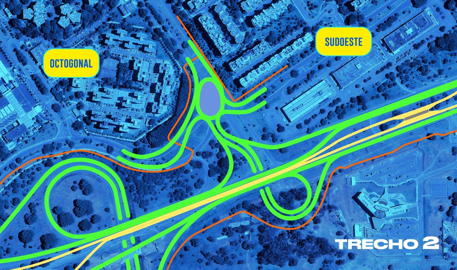 O segundo mais adiantado é o trecho 2. Localizado na altura da via que separa a Octogonal do Sudoeste, ele terá dois viadutos, eliminando a necessidade de semáforos no cruzamento da Octogonal com a Epig e, consequentemente, as recorrentes interrupções provocadas pelas sinalizações verticais.